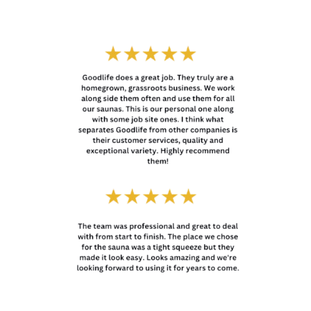 With hundreds of satisfied customers across Canada, Goodlife Sauna is proud to provide an exceptional experience from start to finish. When you purchase from us, you're investing in high-quality craftsmanship, outstanding customer service, and a product designed to enhance your well-being. Our commitment to excellence is reflected in our glowing reviews, and we aim to deliver a 5-star experience to every customer. Your satisfaction is our priority, and we’re confident you'll love your sauna.